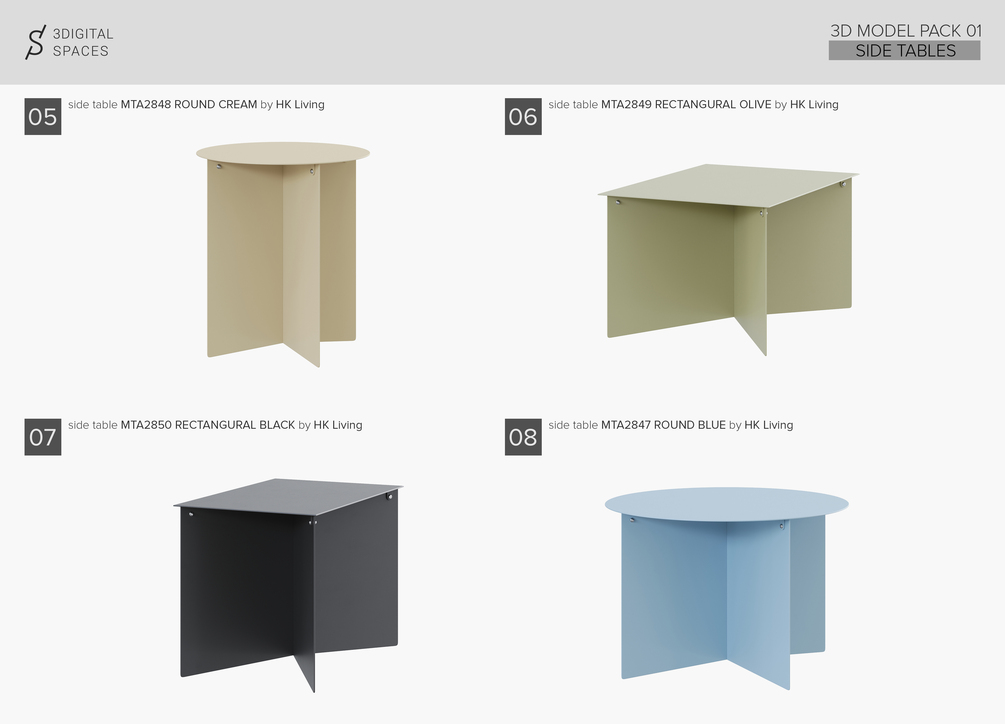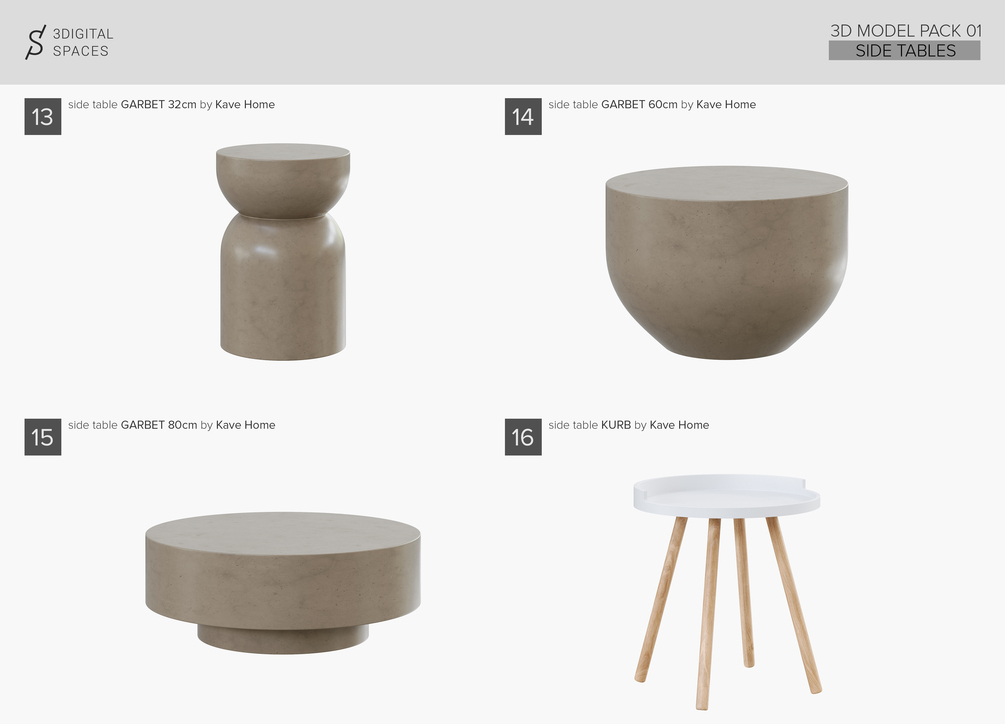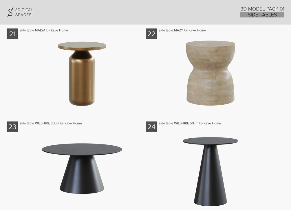 24 realistic side table 3D models made by Kave Home, Gervasoni, HK Living and Kare Design.